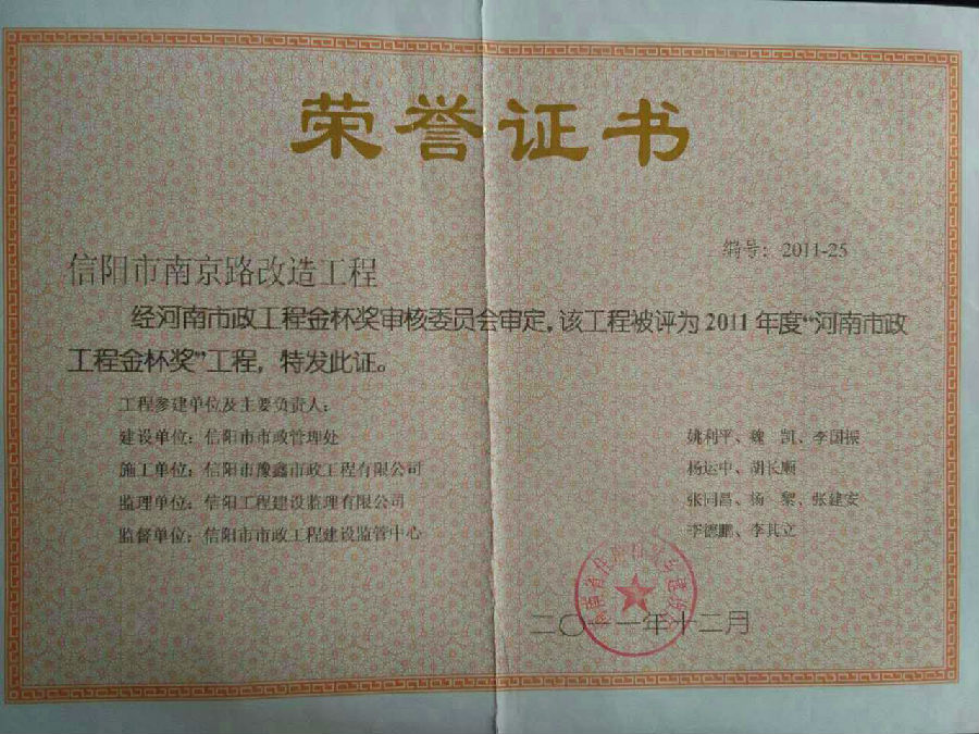 好風憑借力,送我上青云。近年來,公司積極參與城市市政基礎設施建設施工,積極參與市場競爭,先后承擔施工了市政府重點工程南京路道路改造工程、春曉路道路改造工程,東方紅大道道路改造工程、龍江東路新建工程等重點民生工程,其中南京路道路改造工程被省建設廳評為“中州杯”, 春曉路和東方紅大道道路改造工程被省建設廳評為“省優工程”,成為城區一道道亮麗的風景線。參與施工了市典范小區“臺北城上城”、“恒大名都”以及師范學院、職業技術學院、交警支隊和軍區道路工程,參與施工了雞公山管理區、南灣管理區、明港鎮和羅山縣等部分道路小區工程施工,累計大小各類施工工程三百余項,企業影響力不斷擴大、輻射力不斷增強,市場份額不斷提高,企業信譽不斷彰顯,為信陽城市建設做出了積極貢獻,為企業的可持續發展插上了騰飛的翅膀。